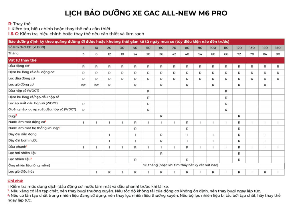 Lần đầu tiên và lần thứ 2 ở mỗi 5.000 km hoặc 3 tháng, các lần tiếp theo sau mỗi 10.000km hoặc 6 tháng, tùy theo điều kiện nào đến trước.